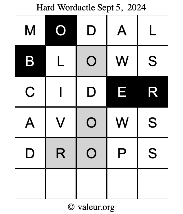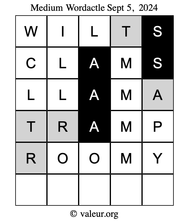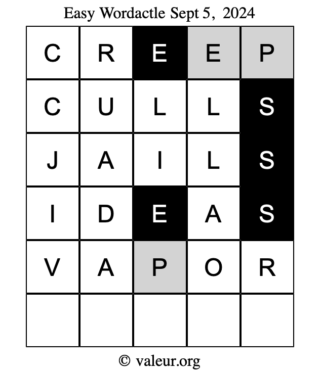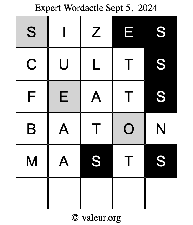 Here are the September 5, 2024 daily four Wordactle puzzles. You are welcome to print a copy of the puzzles and solve them by hand. For your convenience, we have also included the solutions further down the page so you can check your work.