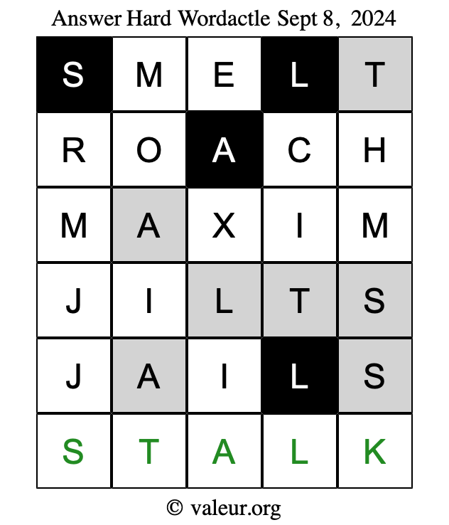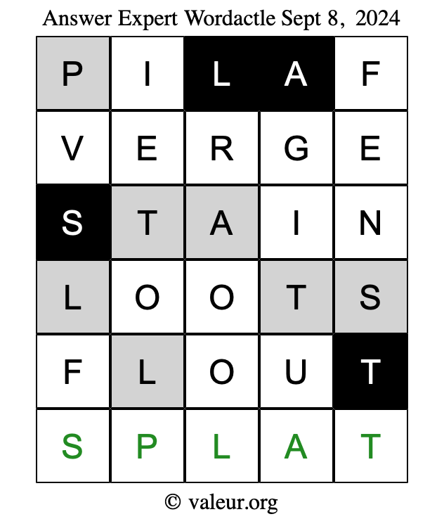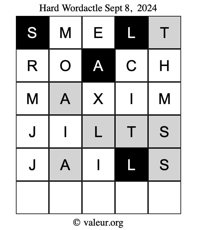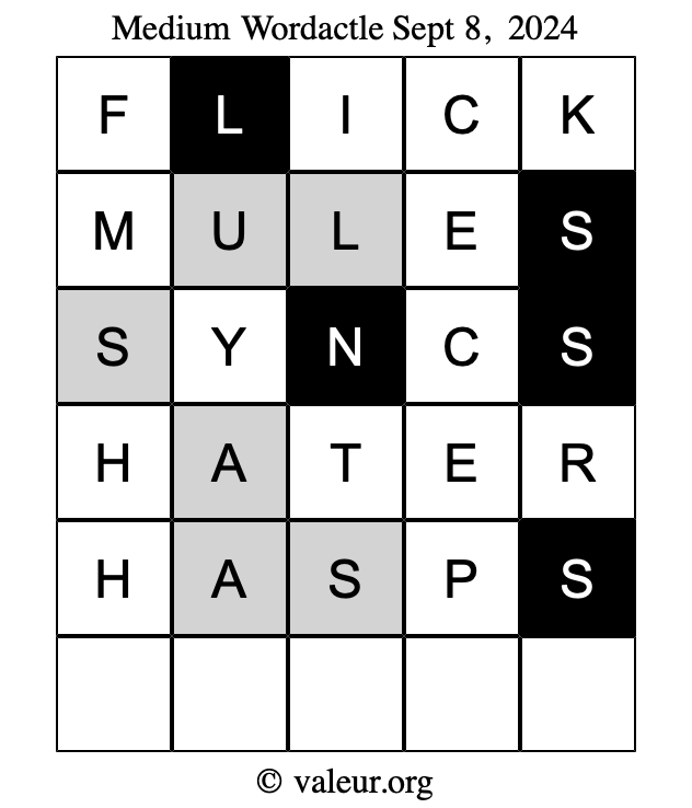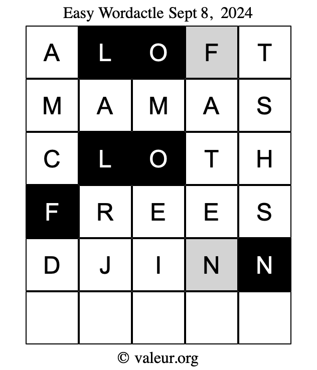 Here are the September 8, 2024 daily four Wordactle puzzles. You are welcome to print a copy of the puzzles and solve them by hand. For your convenience, we have also included the solutions further down the page so you can check your work.