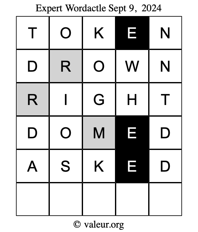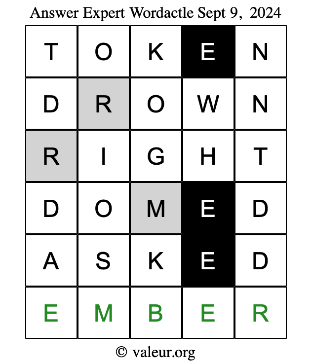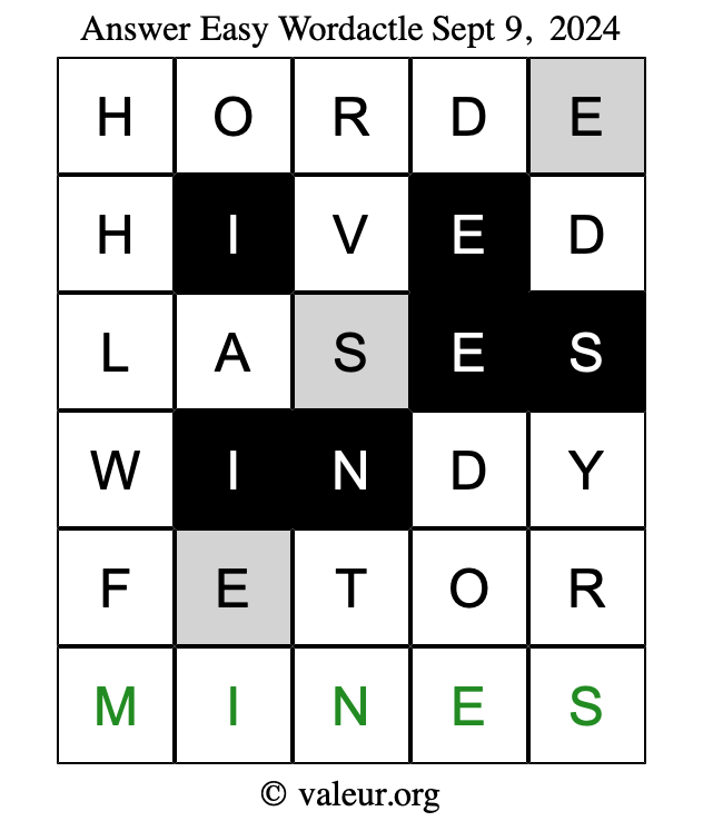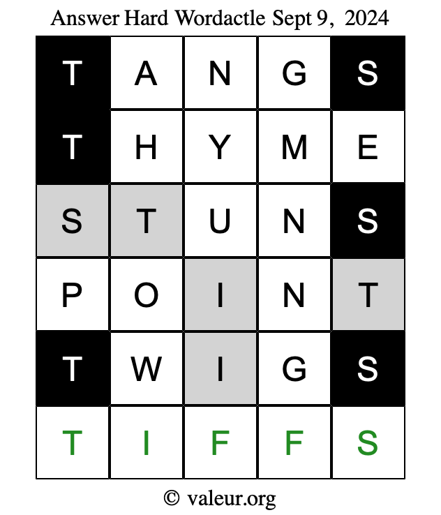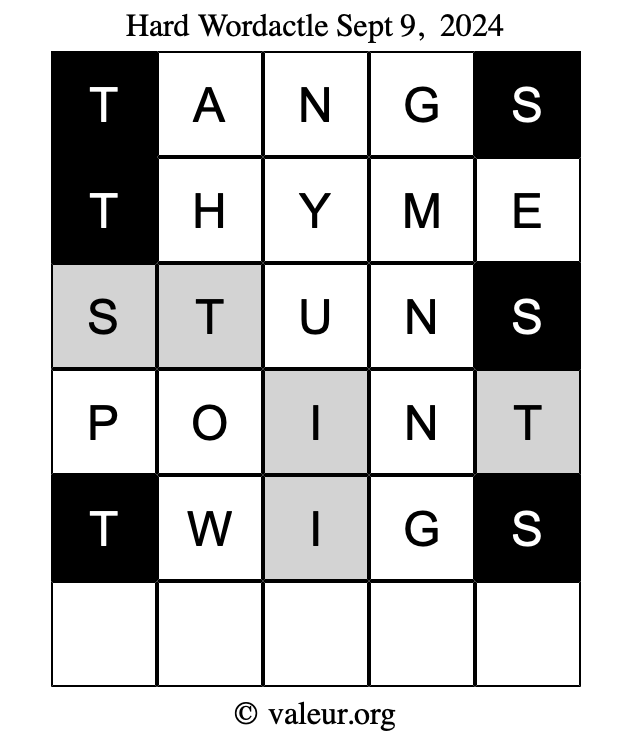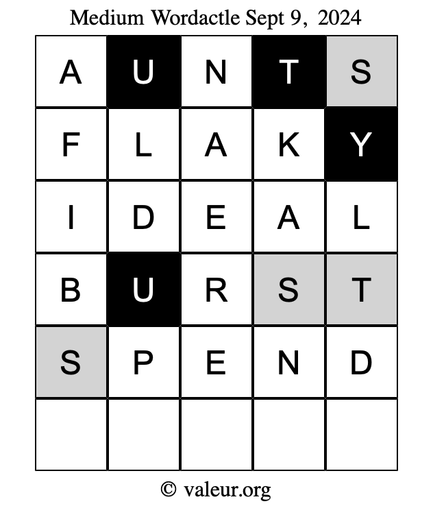 Here are the September 9, 2024 daily four Wordactle puzzles. You are welcome to print a copy of the puzzles and solve them by hand. For your convenience, we have also included the solutions further down the page so you can check your work.