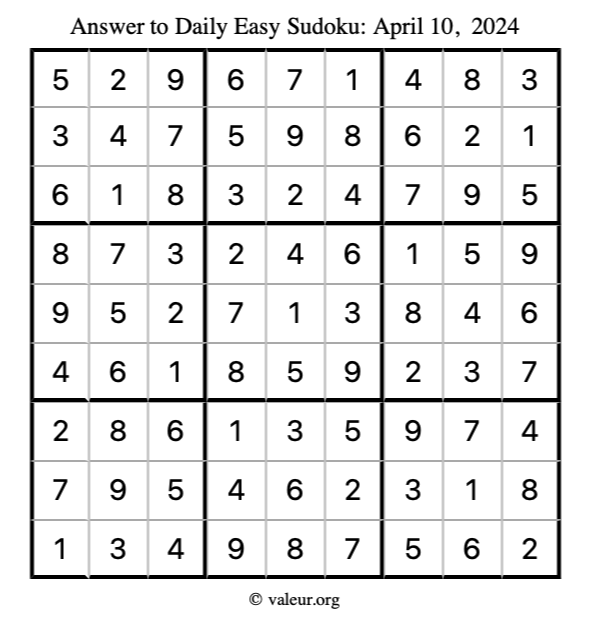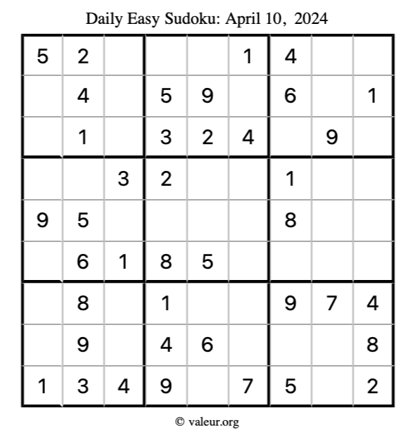 Here is the April 10, 2024 easy sudoku puzzle. You are welcome to print a copy to solve by hand. For your convenience, we have also included the solution further down the page so you can check your work.