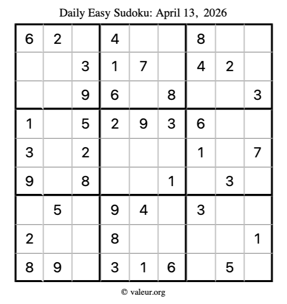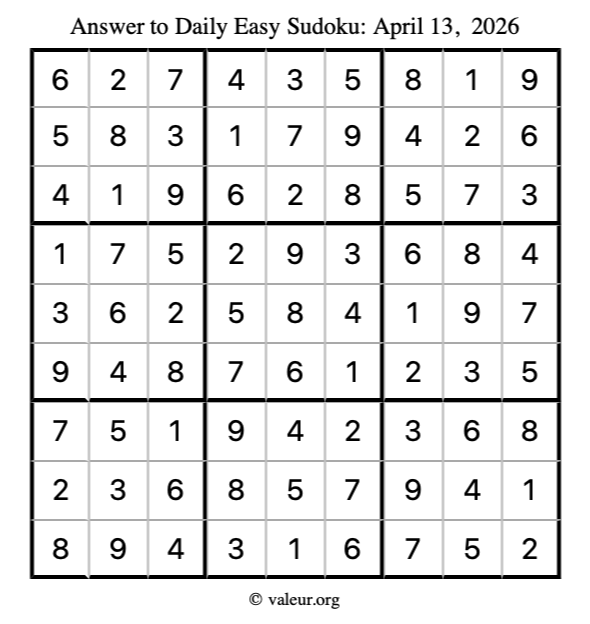 Here is the April 13, 2026 easy sudoku puzzle. You are welcome to print a copy to solve by hand. For your convenience, we have also included the solution further down the page so you can check your work.