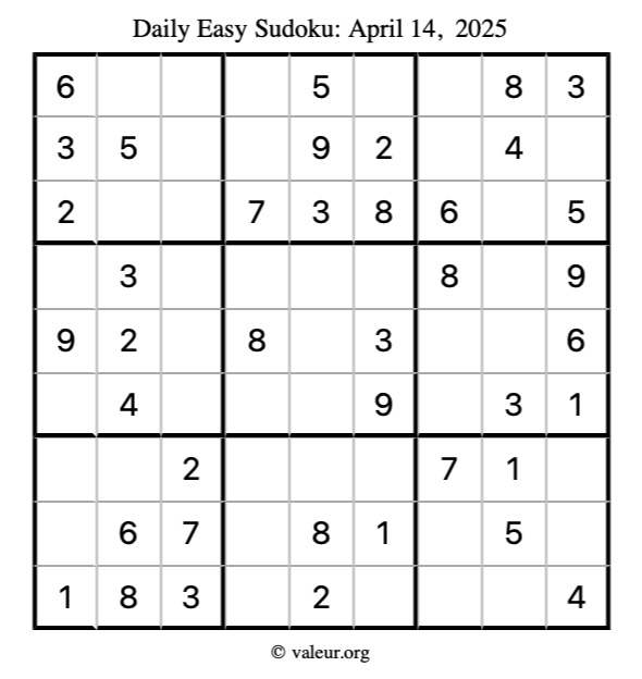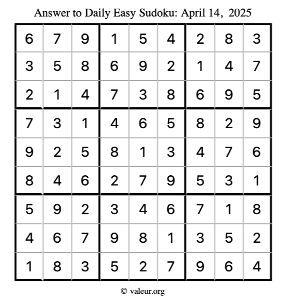 Here is the April 14, 2025 easy sudoku puzzle. You are welcome to print a copy to solve by hand. For your convenience, we have also included the solution further down the page so you can check your work.