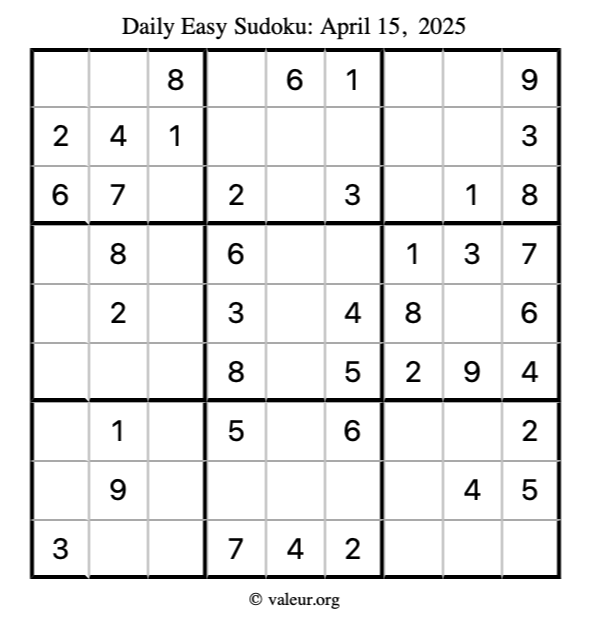Here is the April 15, 2025 easy sudoku puzzle. You are welcome to print a copy to solve by hand. For your convenience, we have also included the solution further down the page so you can check your work.