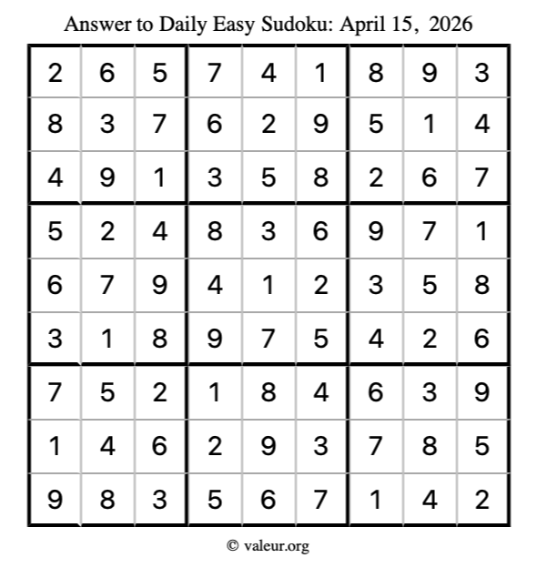 As promised, here is the solution to the April 15, 2026 easy sudoku puzzle: