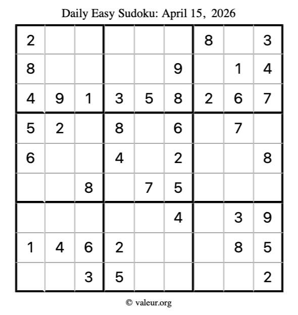 Here is the April 15, 2026 easy sudoku puzzle. You are welcome to print a copy to solve by hand. For your convenience, we have also included the solution further down the page so you can check your work.