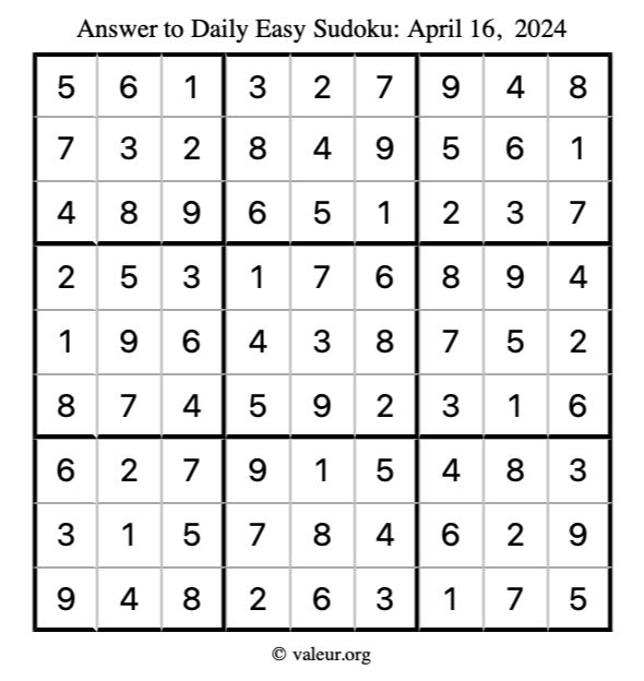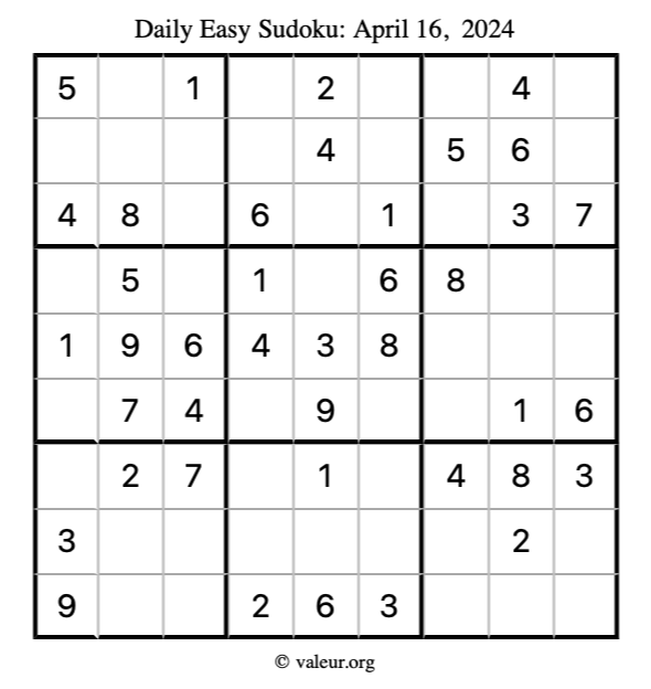 Here is the April 16, 2024 easy sudoku puzzle. You are welcome to print a copy to solve by hand. For your convenience, we have also included the solution further down the page so you can check your work.
