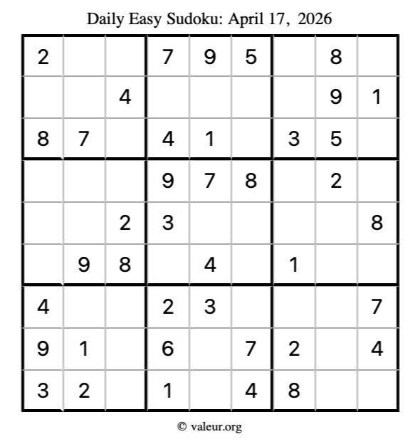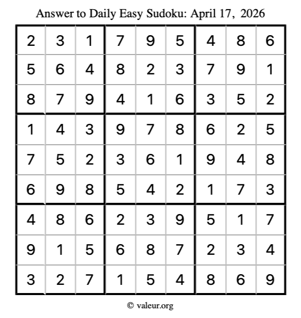 Here is the April 17, 2026 easy sudoku puzzle. You are welcome to print a copy to solve by hand. For your convenience, we have also included the solution further down the page so you can check your work.