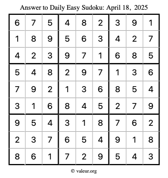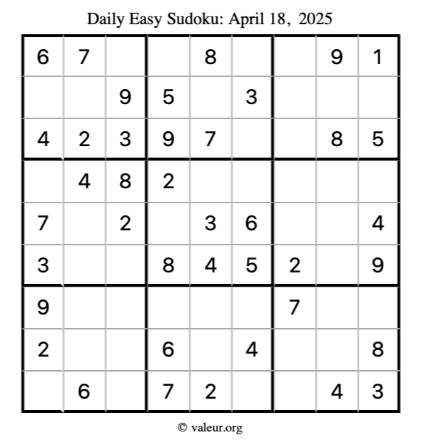 Here is the April 18, 2025 easy sudoku puzzle. You are welcome to print a copy to solve by hand. For your convenience, we have also included the solution further down the page so you can check your work.