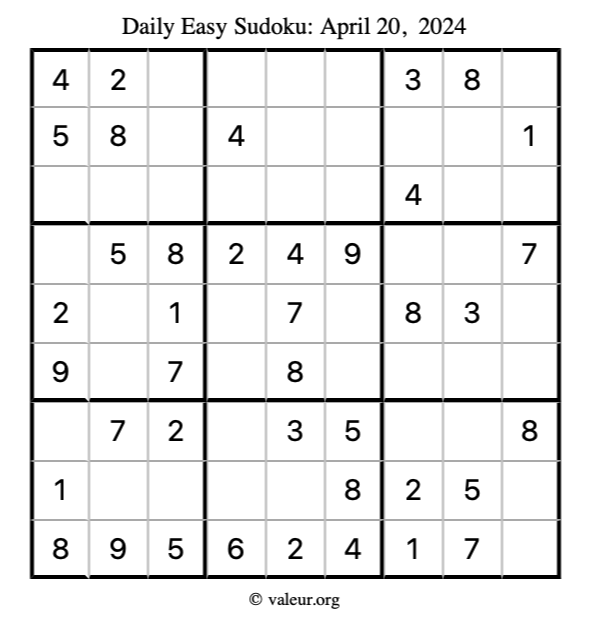 Here is the April 20, 2024 easy sudoku puzzle. You are welcome to print a copy to solve by hand. For your convenience, we have also included the solution further down the page so you can check your work.