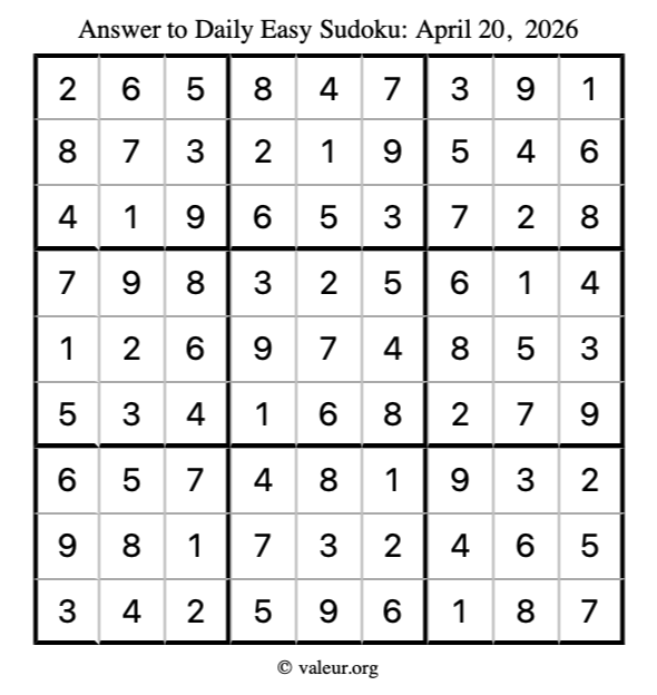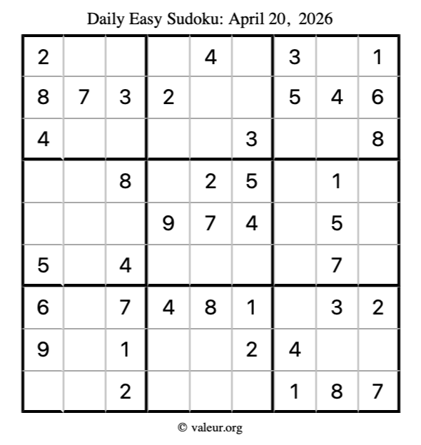 Here is the April 20, 2026 easy sudoku puzzle. You are welcome to print a copy to solve by hand. For your convenience, we have also included the solution further down the page so you can check your work.