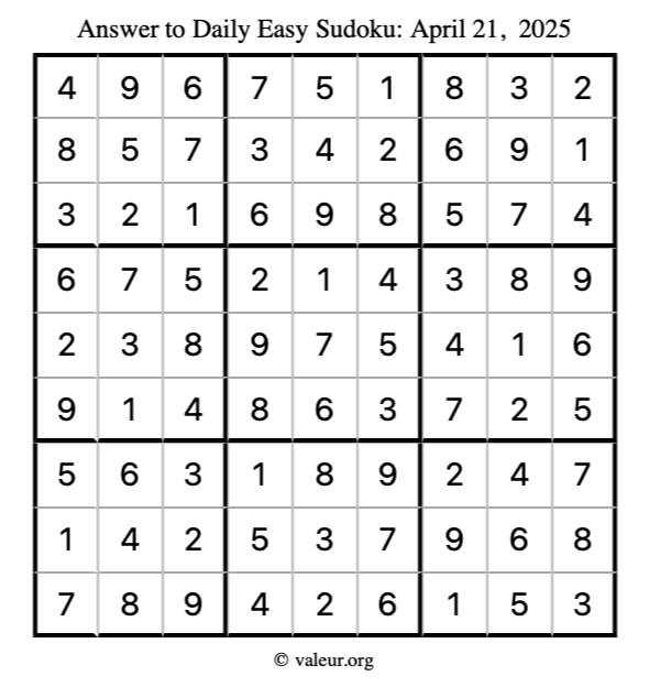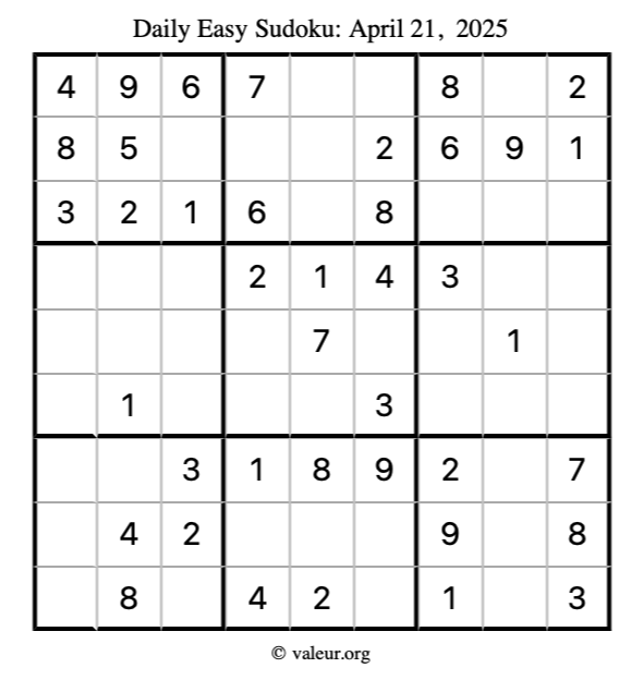 Here is the April 21, 2025 easy sudoku puzzle. You are welcome to print a copy to solve by hand. For your convenience, we have also included the solution further down the page so you can check your work.