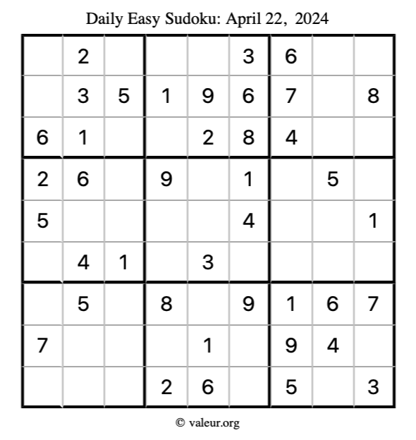 Here is the April 22, 2024 easy sudoku puzzle. You are welcome to print a copy to solve by hand. For your convenience, we have also included the solution further down the page so you can check your work.
