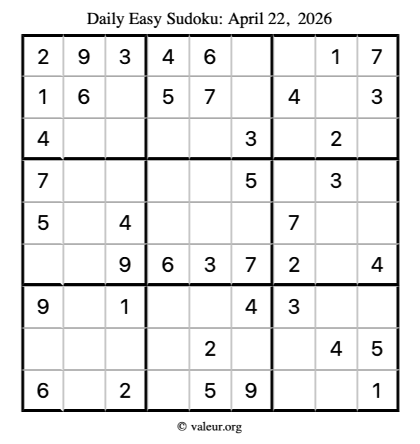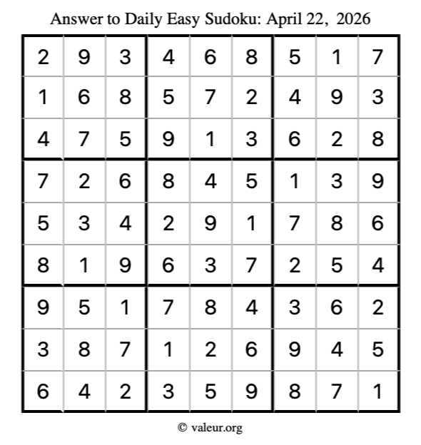 Here is the April 22, 2026 easy sudoku puzzle. You are welcome to print a copy to solve by hand. For your convenience, we have also included the solution further down the page so you can check your work.
