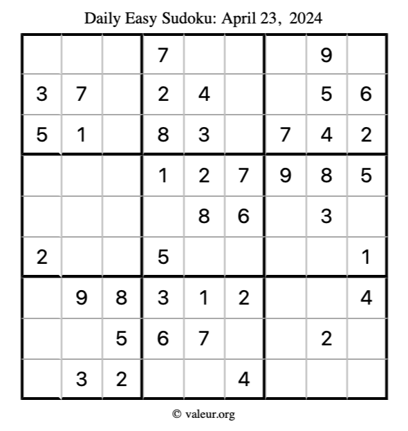 Here is the April 23, 2024 easy sudoku puzzle. You are welcome to print a copy to solve by hand. For your convenience, we have also included the solution further down the page so you can check your work.