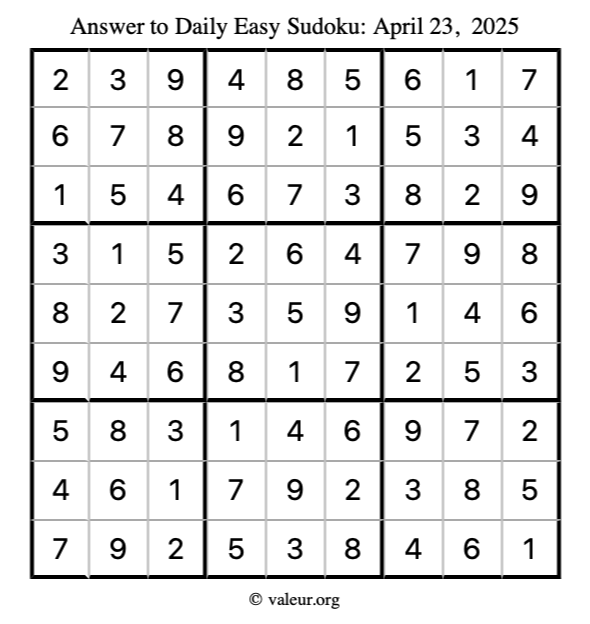 Here is the April 23, 2025 easy sudoku puzzle. You are welcome to print a copy to solve by hand. For your convenience, we have also included the solution further down the page so you can check your work.