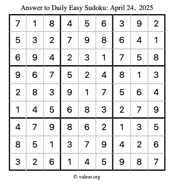 As promised, here is the solution to the April 24, 2025 easy sudoku puzzle: