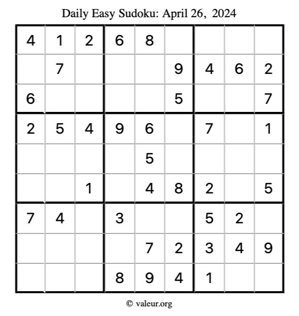 Here is the April 26, 2024 easy sudoku puzzle. You are welcome to print a copy to solve by hand. For your convenience, we have also included the solution further down the page so you can check your work.
