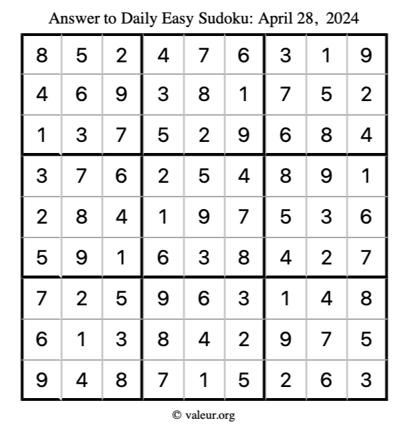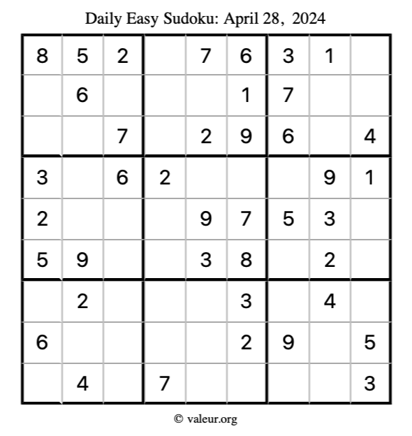 Here is the April 28, 2024 easy sudoku puzzle. You are welcome to print a copy to solve by hand. For your convenience, we have also included the solution further down the page so you can check your work.