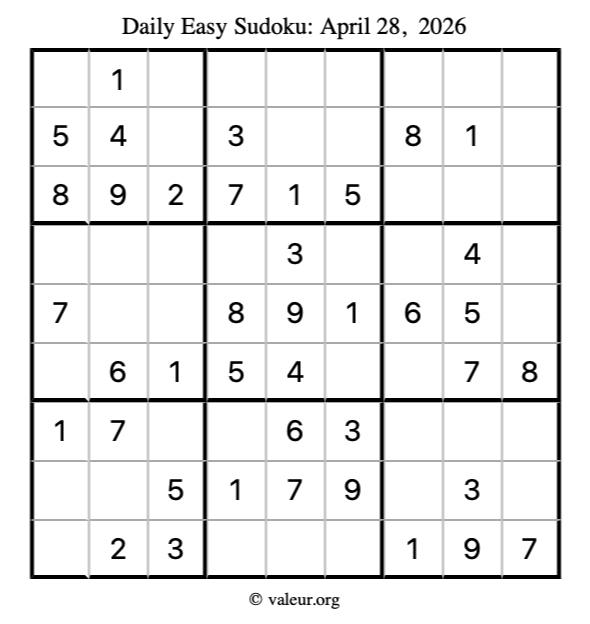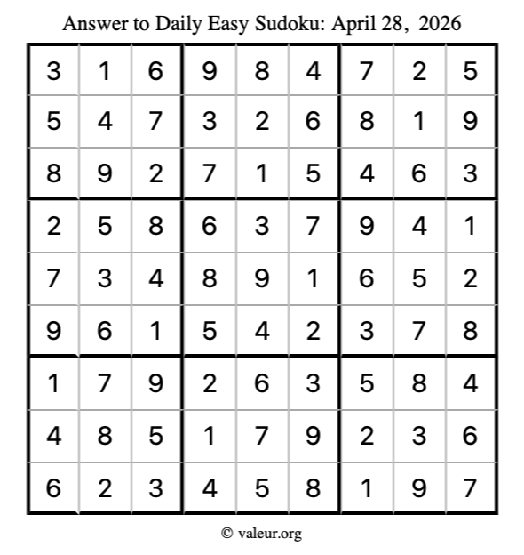 Here is the April 28, 2026 easy sudoku puzzle. You are welcome to print a copy to solve by hand. For your convenience, we have also included the solution further down the page so you can check your work.