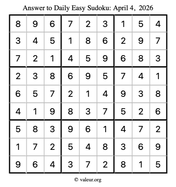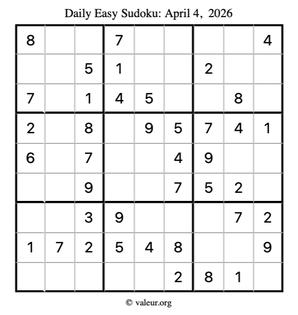 Here is the April 4, 2026 easy sudoku puzzle. You are welcome to print a copy to solve by hand. For your convenience, we have also included the solution further down the page so you can check your work.