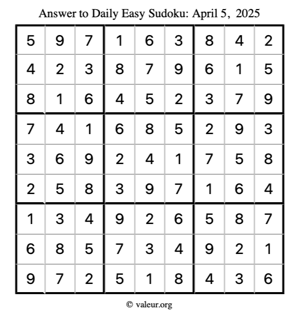 As promised, here is the solution to the April 5, 2025 easy sudoku puzzle: