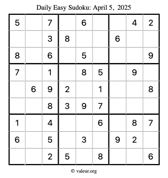 Here is the April 5, 2025 easy sudoku puzzle. You are welcome to print a copy to solve by hand. For your convenience, we have also included the solution further down the page so you can check your work.