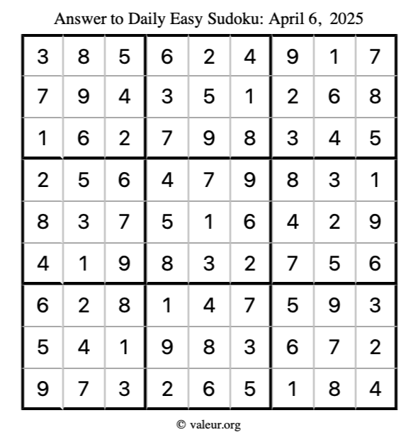 As promised, here is the solution to the April 6, 2025 easy sudoku puzzle: