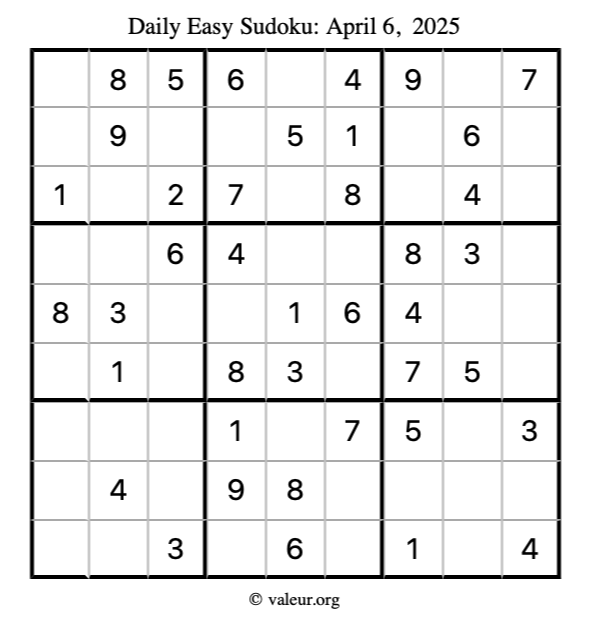 Here is the April 6, 2025 easy sudoku puzzle. You are welcome to print a copy to solve by hand. For your convenience, we have also included the solution further down the page so you can check your work.