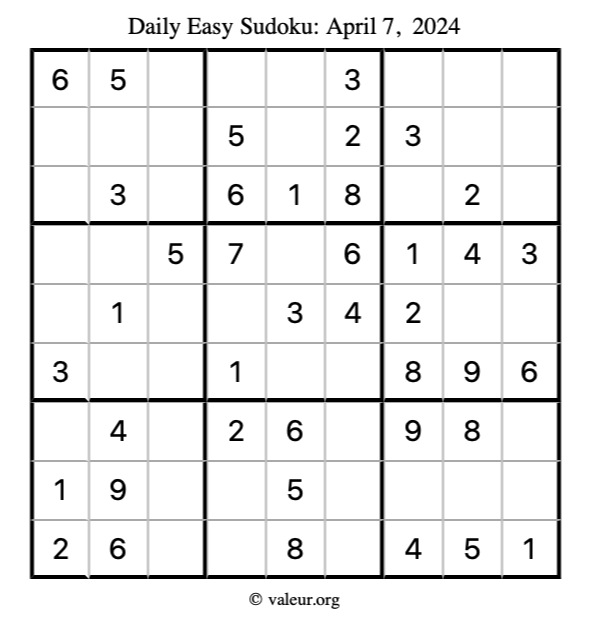 Here is the April 7, 2024 easy sudoku puzzle. You are welcome to print a copy to solve by hand. For your convenience, we have also included the solution further down the page so you can check your work.