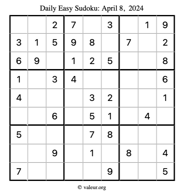 Here is the April 8, 2024 easy sudoku puzzle. You are welcome to print a copy to solve by hand. For your convenience, we have also included the solution further down the page so you can check your work.