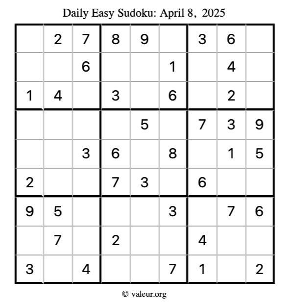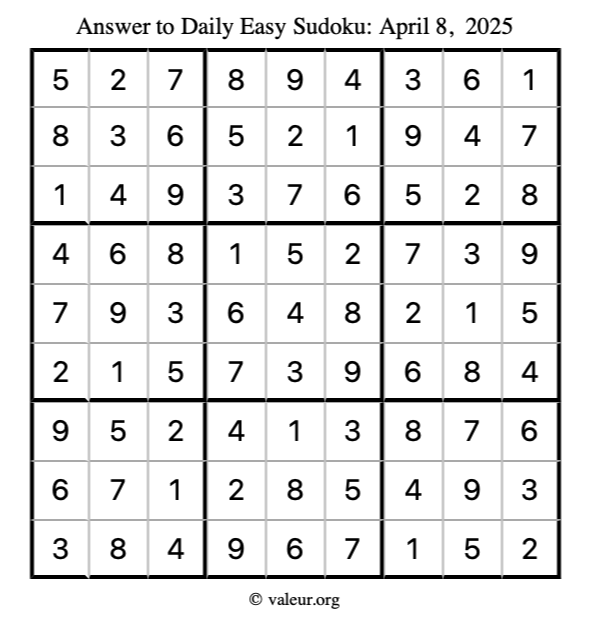 Here is the April 8, 2025 easy sudoku puzzle. You are welcome to print a copy to solve by hand. For your convenience, we have also included the solution further down the page so you can check your work.