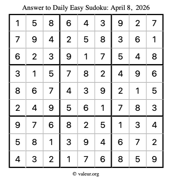 As promised, here is the solution to the April 8, 2026 easy sudoku puzzle: