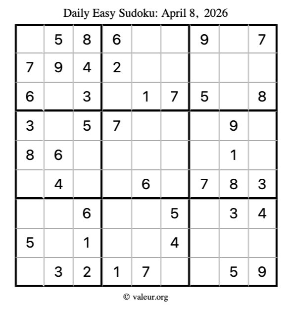 Here is the April 8, 2026 easy sudoku puzzle. You are welcome to print a copy to solve by hand. For your convenience, we have also included the solution further down the page so you can check your work.