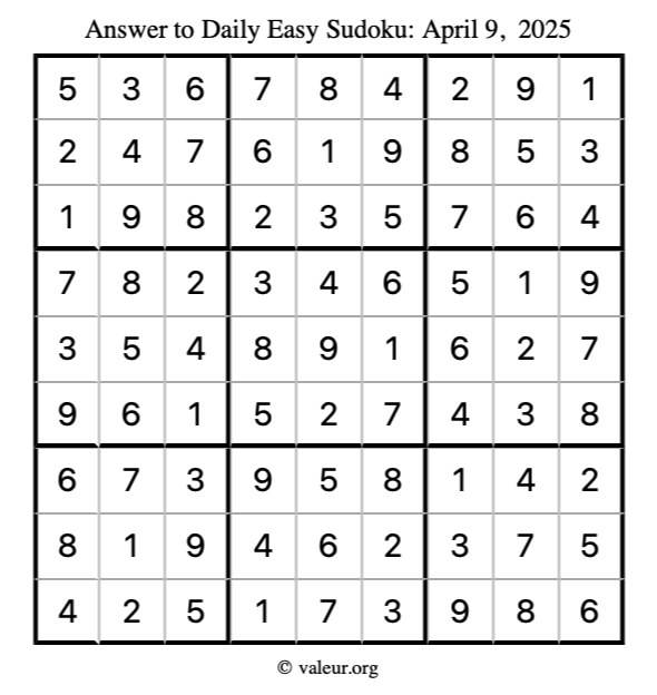Here is the April 9, 2025 easy sudoku puzzle. You are welcome to print a copy to solve by hand. For your convenience, we have also included the solution further down the page so you can check your work.