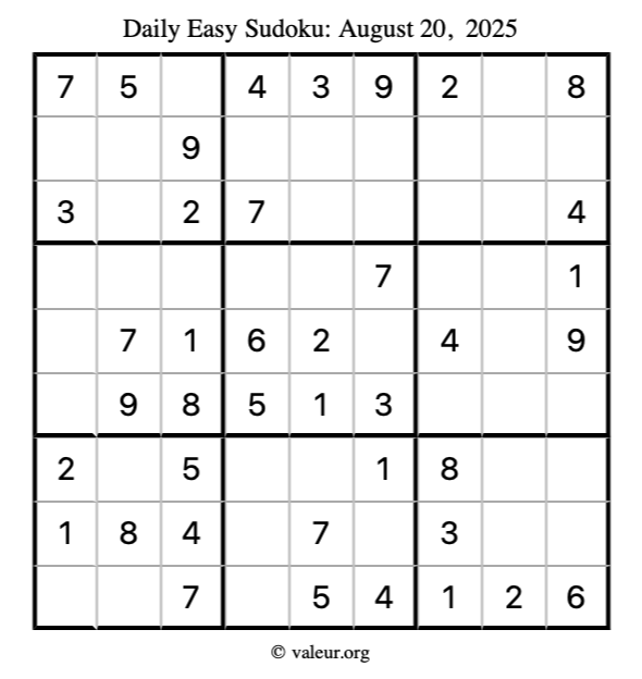 Here is the August 20, 2025 easy sudoku puzzle. You are welcome to print a copy to solve by hand. For your convenience, we have also included the solution further down the page so you can check your work.