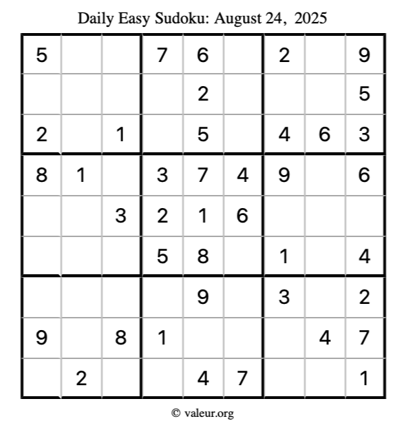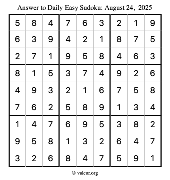 Here is the August 24, 2025 easy sudoku puzzle. You are welcome to print a copy to solve by hand. For your convenience, we have also included the solution further down the page so you can check your work.