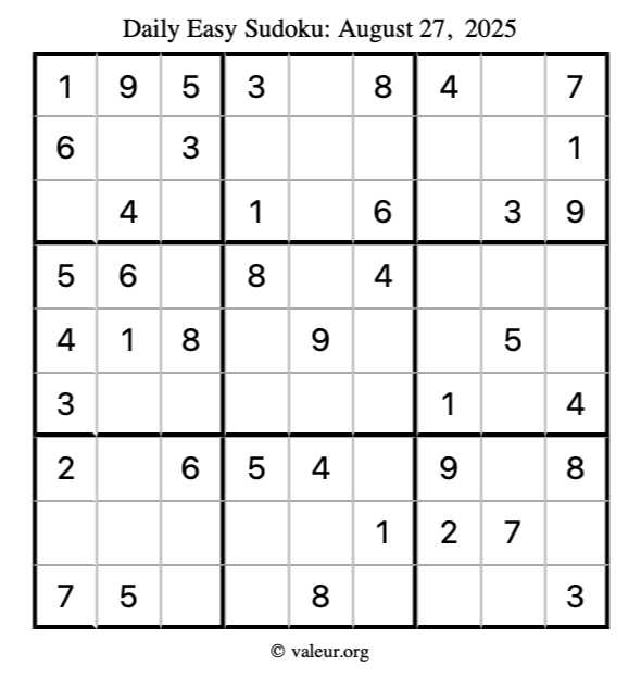 Here is the August 27, 2025 easy sudoku puzzle. You are welcome to print a copy to solve by hand. For your convenience, we have also included the solution further down the page so you can check your work.