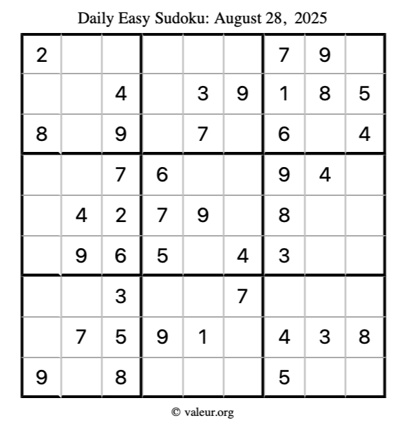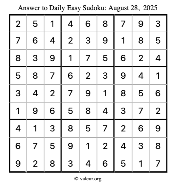 Here is the August 28, 2025 easy sudoku puzzle. You are welcome to print a copy to solve by hand. For your convenience, we have also included the solution further down the page so you can check your work.