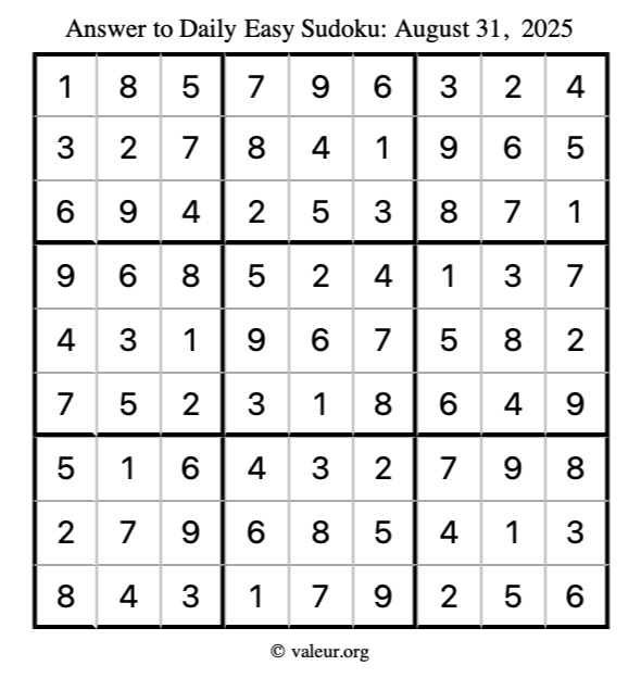 Here is the August 31, 2025 easy sudoku puzzle. You are welcome to print a copy to solve by hand. For your convenience, we have also included the solution further down the page so you can check your work.