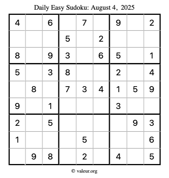 Here is the August 4, 2025 easy sudoku puzzle. You are welcome to print a copy to solve by hand. For your convenience, we have also included the solution further down the page so you can check your work.