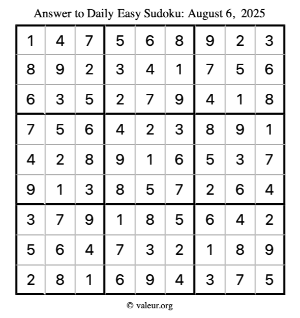 Here is the August 6, 2025 easy sudoku puzzle. You are welcome to print a copy to solve by hand. For your convenience, we have also included the solution further down the page so you can check your work.