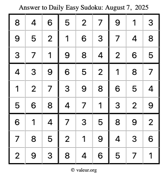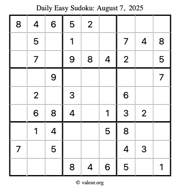 Here is the August 7, 2025 easy sudoku puzzle. You are welcome to print a copy to solve by hand. For your convenience, we have also included the solution further down the page so you can check your work.