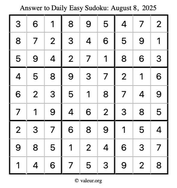 Here is the August 8, 2025 easy sudoku puzzle. You are welcome to print a copy to solve by hand. For your convenience, we have also included the solution further down the page so you can check your work.
