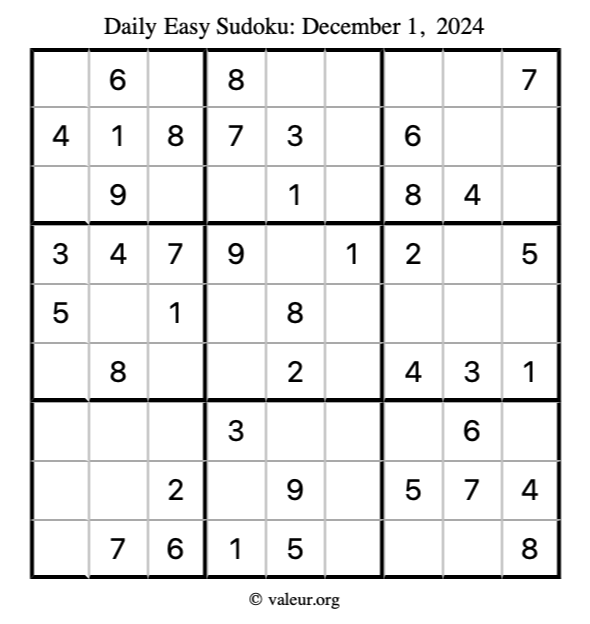 Here is the December 1, 2024 easy sudoku puzzle. You are welcome to print a copy to solve by hand. For your convenience, we have also included the solution further down the page so you can check your work.