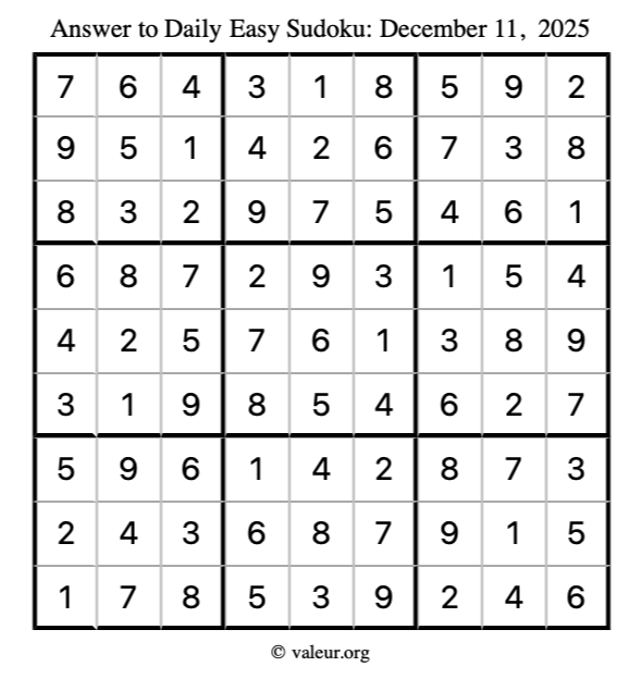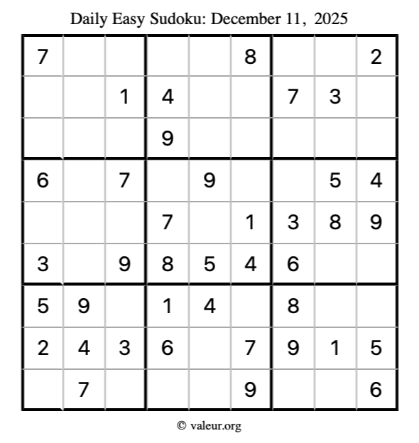 Here is the December 11, 2025 easy sudoku puzzle. You are welcome to print a copy to solve by hand. For your convenience, we have also included the solution further down the page so you can check your work.