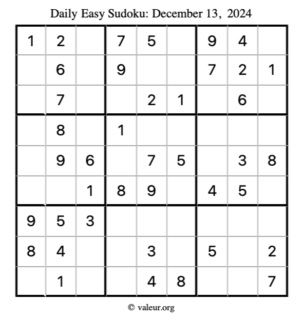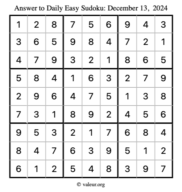 Here is the December 13, 2024 easy sudoku puzzle. You are welcome to print a copy to solve by hand. For your convenience, we have also included the solution further down the page so you can check your work.