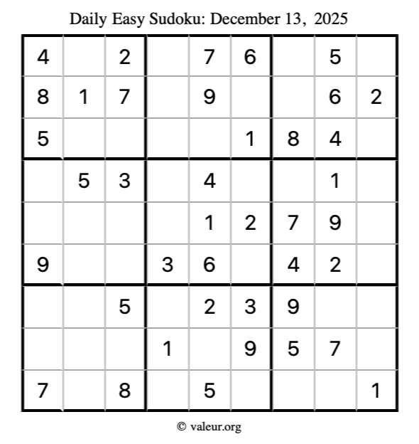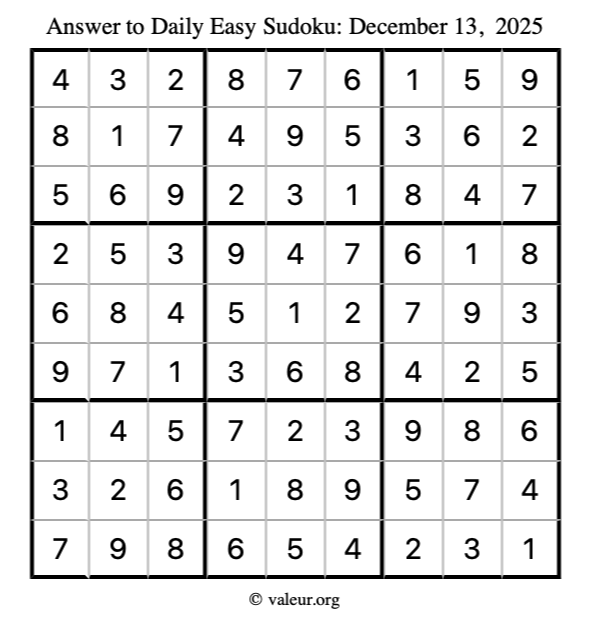 Here is the December 13, 2025 easy sudoku puzzle. You are welcome to print a copy to solve by hand. For your convenience, we have also included the solution further down the page so you can check your work.