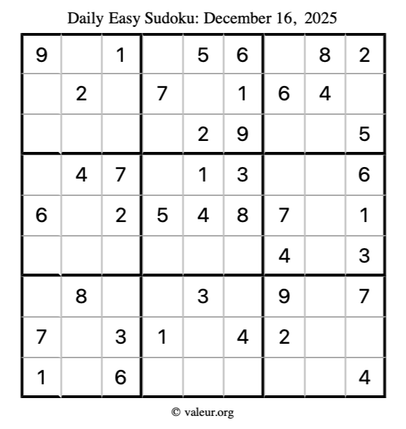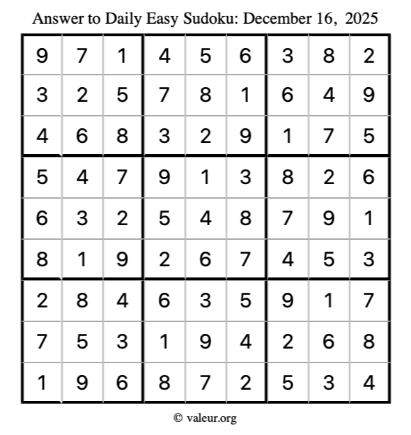 Here is the December 16, 2025 easy sudoku puzzle. You are welcome to print a copy to solve by hand. For your convenience, we have also included the solution further down the page so you can check your work.