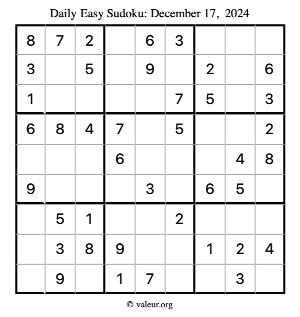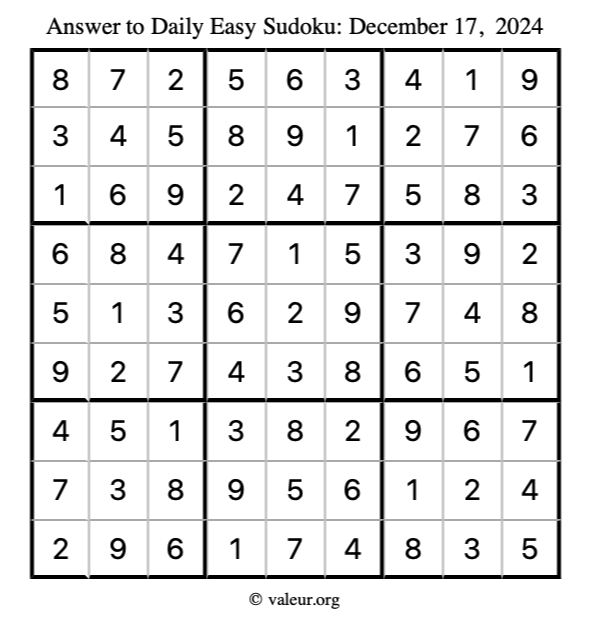 Here is the December 17, 2024 easy sudoku puzzle. You are welcome to print a copy to solve by hand. For your convenience, we have also included the solution further down the page so you can check your work.