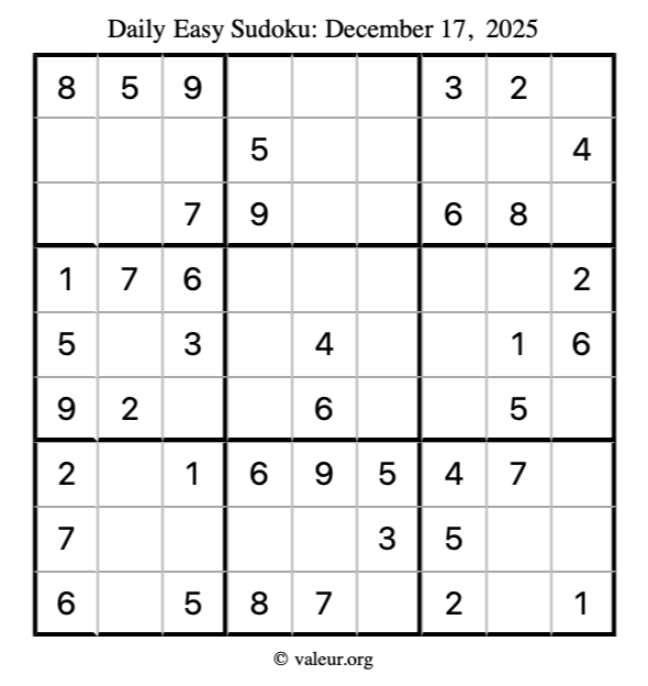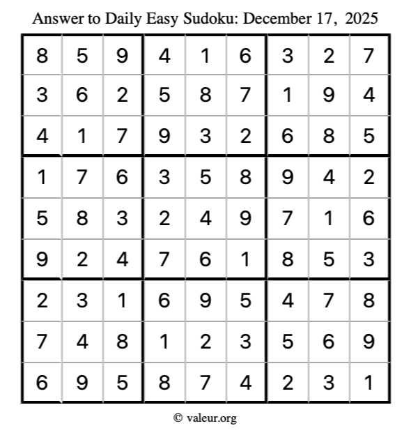 Here is the December 17, 2025 easy sudoku puzzle. You are welcome to print a copy to solve by hand. For your convenience, we have also included the solution further down the page so you can check your work.